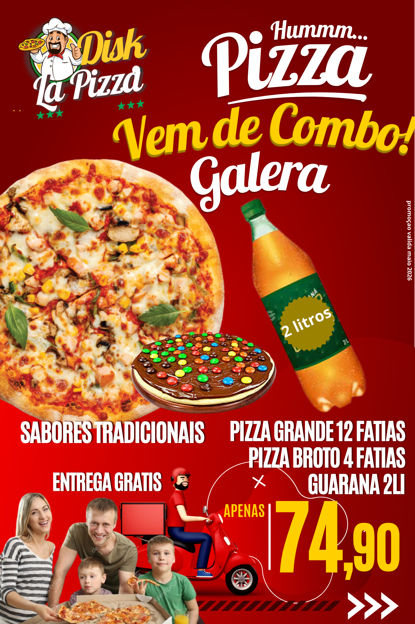 1 pizza Grande (até 3 sabores) + 1 pizza Broto (1 sabor) + 1 Guaraná Kuat 2L